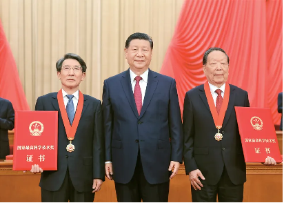 2024年6月24日,全国科技大会、国家科学技术奖励大会和中国科学院第二十一次院士大会、中国工程院第十七次院士大会在北京人民大会堂隆重召开。中共中央总书记、国家主席、中央军委主席习近平向获得2023年度国家最高科学技术奖的武汉大学李德仁院士(右)和清华大学薛其坤院士(左)颁奖。 新华社记者 鞠鹏/摄
